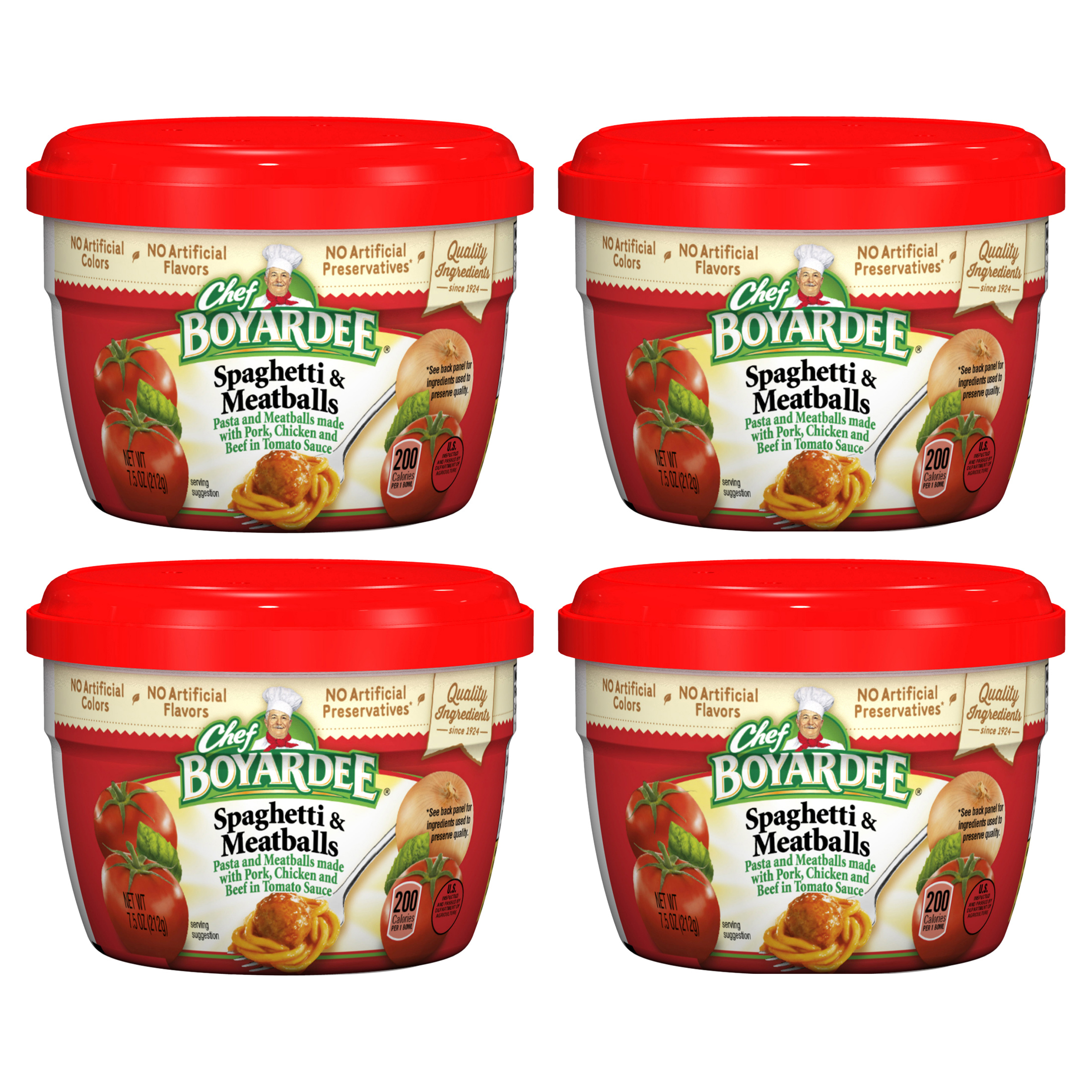 Chef Boyardee Spaghetti and Meatballs, Microwave Pasta, 4 Pack ... - eBay Find many great new & used options and get the best deals for Chef Boyardee Spaghetti and Meatballs, Microwave Pasta, 4 Pack, 14.5 Oz at the best online prices at eBay! Free shipping for many products! ... Calories per Serving. 250. Type. Spaghetti. Seller assumes all responsibility for this listing.