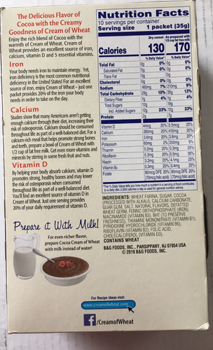 Instant Cream of Wheat, Cream of Rice, Cream of Wheat Flavors Our Favorites. Cocoa Nut with Real Almonds. Maple Brown Sugar. Original 2½ Minute. Original. Cream of wheat Nutrition Facts - Eat This Much Cream of wheat Nutrition Facts - Eat This Much Cream of wheat Cereals, instant, prepared with water, without salt Report a problem with this food Find on Amazon Percent calories from... Quick stats 149.4 Calories 31.5g Carbs (30.1g net carbs) 0.6g Fat 4.4g Protein Estimated $0.15 Try our free Diet Generator I want to eat calories in meals. The Untold Truth Of Cream Of Wheat - Mashed.com Jan 4, 2022 · Generally referred to as farina cereal, Cream of Wheat is a porridge made from the endosperm of the wheat grain. Per Flour.com, the endosperm is the source of white flour and makes up the bulk of the wheat grain, at about 83% by weight. Cream of Wheat is popular as a delicious, filling breakfast option, and according to its manufacturer's ... Cream of Wheat, Cream of Rice - Hot Breakfast Cereal and More Cream of Wheat®. Simply good food that warms and nourishes both body and soul. Our Favorites Cocoa Nut with Real Almonds Maple Brown Sugar Original 2½ Minute Original Banana Walnut Cocoa Nut with Real Almonds Maple Brown Sugar Original 2½ Minute Original Banana Walnut Cocoa Nut with Real Almonds Maple Brown Sugar Original 2½ Minute Find Your Flavor